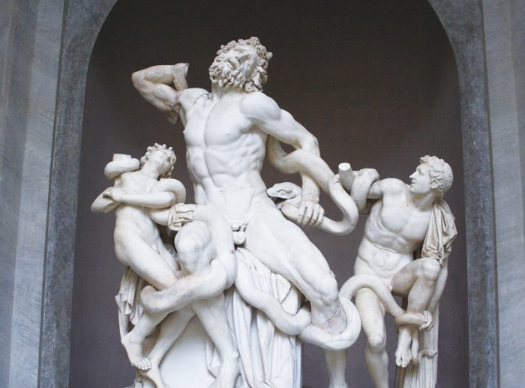 베길리우스의 <아에네이드>에 나오는 장면을 묘사한 대리석 군상이다. 트로이 제자인 라오콘은 트로이 전쟁 때 그리스군의 목마를 받아들이는 것을 반대하여 신의 노여움을 사, 포세이돈이 보낸 두 마리의 거대한 뱀에게 라오콘과 두 아들은 살해당했다. 조각은 거대한 뱀에게 칭칭 감겨 고통스러워하는 라오콘과 두 아들의 격노를 표현한 것이다.