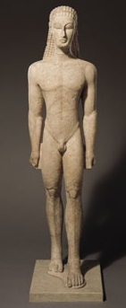 (좌) 남성 환조 입상이다. 코우로스는 남성 조각을 의미한다. 초기 이집트 영향으로 좌우대칭을 이루고 정면을 바라보며 한 발이 앞으로 나와있지만, 무릎은 높낮이가 같아 어색한 모습을 보인다. 세부 표현이 사실적이지 않고, 어색하고 딱딱한 느낌의 아르카익 미술의 특징을 보여준다.