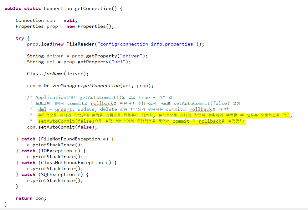 DriverMager.getConnection(url, user, password) ->properties 파일로 따로 뺄때는 (user.prop)