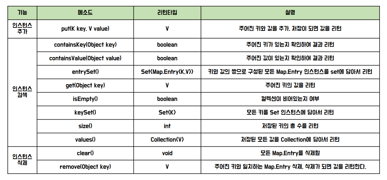 - 구현 클래스 : HashMap, HashTable, TreeMap