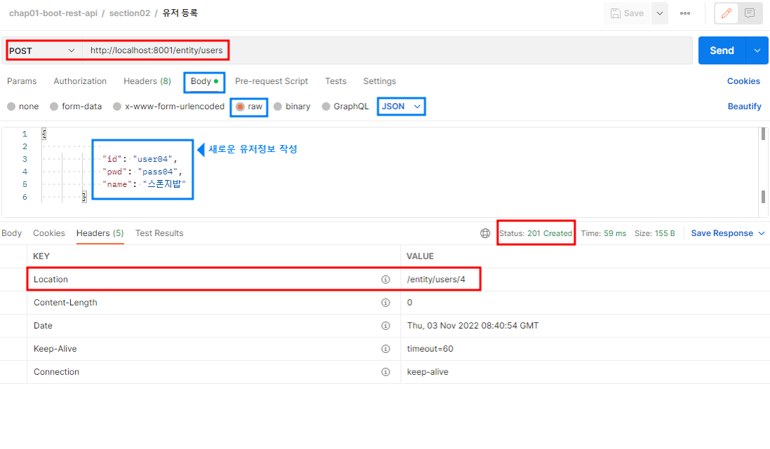조회 시에는 200번 코드를 응답하지만 삽입 시에는 201번 코드를 응답한다.