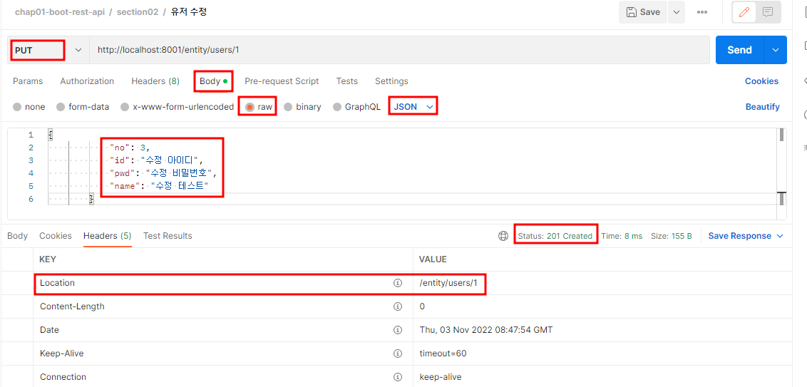 수정 요청으로 자원의 내용이 변경 된다면 역시 201 코드로 응답한다.