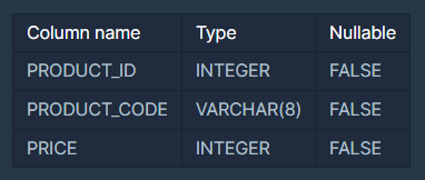 PRODUCT_ID, PRODUCT_CODE, PRICE는 각각 상품 ID, 상품코드, 판매가를 나타냅니다.