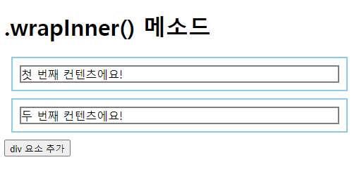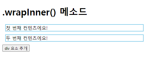 | .wrapInner() | 선택한 요소에 포함되는 새로운 요소를 추가함. |