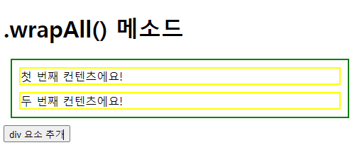 | .wrapAll() | 선택한 모든 요소를 포함하는 새로운 요소를 추가함. |