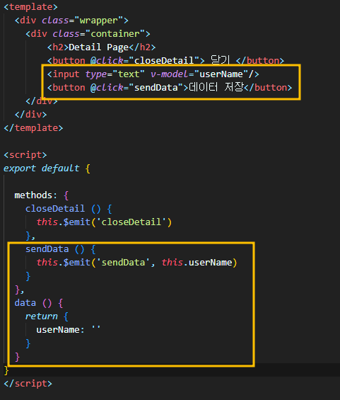 sendData 라는 메소드에 $emit을 사용하여 보낼 데이터 설정하기 , this.$emit('보낼 메세지', '보낼 데이터')