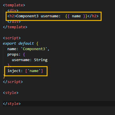 → inject : ['넘어온provide이름'] 형식으로 작성하고 provide이름으로 꺼내서 값을 출력한다.