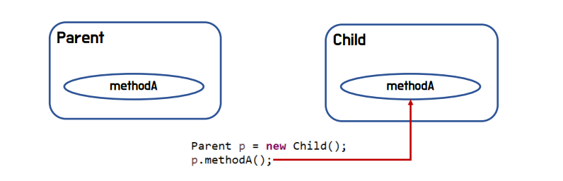 - 동적바인딩 : 컴파일시에는 해당 타입의 메소드와 연결되어 있다가 실행 시간(runtime)에 실제 객체가 가진 오버라이딩 된 메소드로 바인딩이 바뀌어 동작하는 것