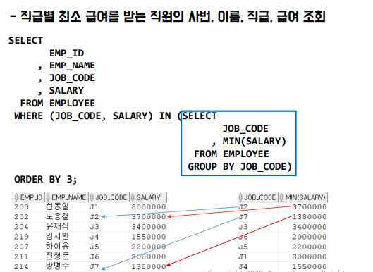 - 서브쿼리의 조회 결과 값의 컬럼이 여러 개 일 때