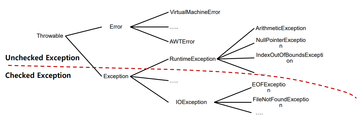 - 예외 클래스들은 상속구조를 가지고 카테고리화 되어 있음.