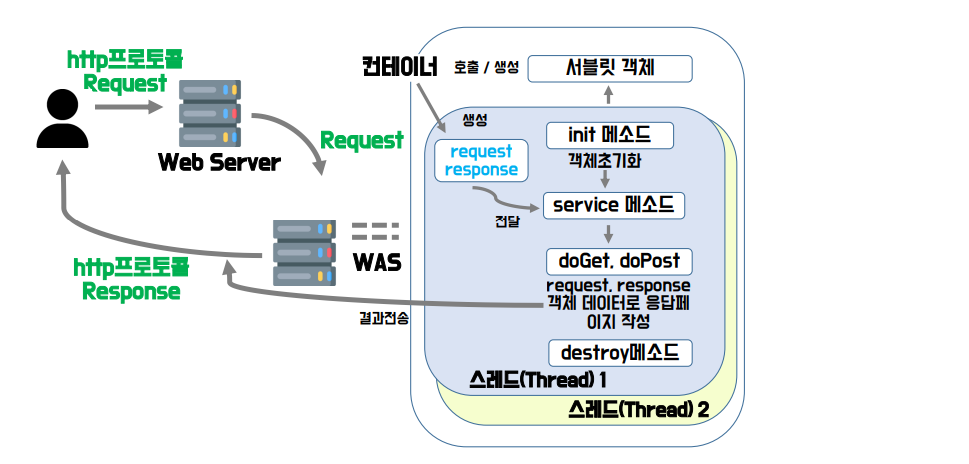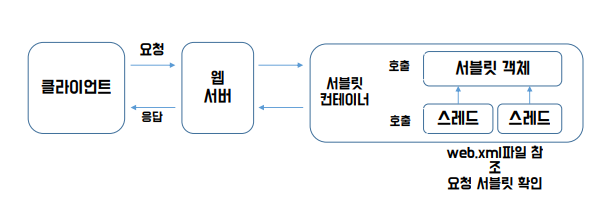 : 웹 서버에서 온 요청을 받아 서블릿 class를 관리하는 역할(생명주기)을 한다.