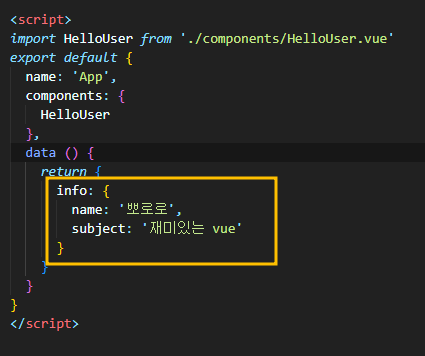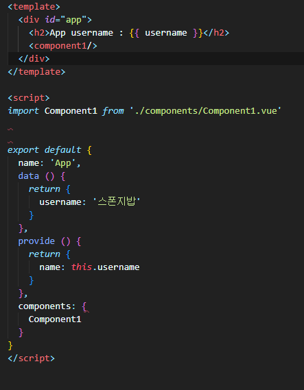 📌componet1을 자식 컴포넌트로 등록한 App.vue 📌componet1은 componet2를 componet2는 componet3을 자식 컴포넌트로 등록 → 마지막 자식 컴포넌트인 componet3에서 상위 부모컴포넌트인 App.vue의 prop을 받는 방법으로 , App.vue부터componet3.vue 까지 한 단계씩 prop을 전달하는 방법이 있지만, 이 방법은 번거로움으로 provide & inject 을 사용해서 prop을 보낸다. Provide & Inject 를 사용하여 prop 넘겨주기 ✔ provide : 데이터를 넘겨주는 쪽에서 사용(부모컴포넌트) ✔ inject : 데이터를 넘겨 받을 곳에서 사용(자식컴포넌트) 📌 App 컴포넌트에서 provide에 prop으로 보낼 변수명과 ..