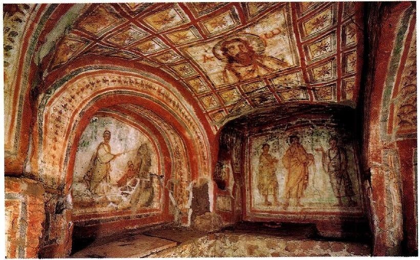 카타콤 미술 - 박해받던 시대의 기독교 미술은 기독교인의 지하 무덤이자 비밀 예배 장소였던 카타콤에서 확인 할 수 있다. 카타콤의 천장과 벽에 그려진 그림을 보면 그들의 일차적 관심은 현세보다 구세주와 함께하는 내세에 있다는 걸 확인할 수 있다. 그들은 그리스 로마 시대에 중시했던 인간의 이상과 육체미, 힘과 아름다움의 조화보다는 그리스도의 영광과 구원, 참뜻과 행적 등을 표현하는 데 더 큰 의미를 두었다.