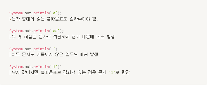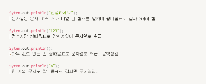 - java에서는 ""로 묶여 있는 값을 문자열로 인식