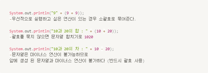 - ex) "제 나이는" + 123 + 45 + "입니다" 의 실행 값은 제 나이는 12345 입니다.