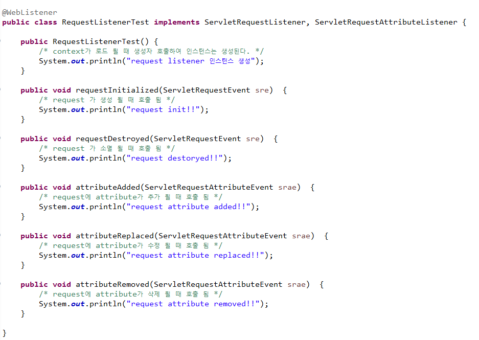 : 웹 컨테이너가 관리하는 라이프 사이클 사이에 발생하는 이벤트를 감지하여 해당 이벤트가 발생 시 해당 이벤트에 대한