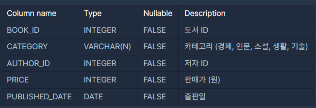 조건에 맞는 도서 리스트 출력하기 문제 BOOK 테이블에서 2021년에 출판된 '인문' 카테고리에 속하는 도서 리스트를 찾아서 도서 ID(BOOK_ID), 출판일 (PUBLISHED_DATE)을 출력하는 SQL문을 작성해주세요. 결과는 출판일을 기준으로 오름차순 정렬해주세요. 주의사항 PUBLISHED_DATE의 데이트 포맷이 예시와 동일해야 정답처리 됩니다. BOOK 테이블 예시 💡 정답 SELECT BOOK_ID , DATE_FORMAT(PUBLISHED_DATE, "%Y-%m-%d") AS PUBLISHED_DATE FROM BOOK WHERE CATEGORY = '인문' AND YEAR(PUBLISHED_DATE) = '2021' ORDER BY PUBLISHED_DATE ASC;